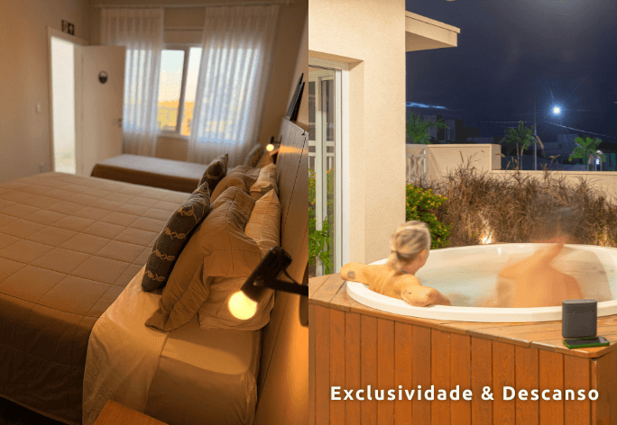 À noite, o convite é para relaxar na pousada. As áreas de lazer, como jacuzzis e piscina aquecida, oferecem momentos de descanso e contemplação após um dia cheio de atividades.